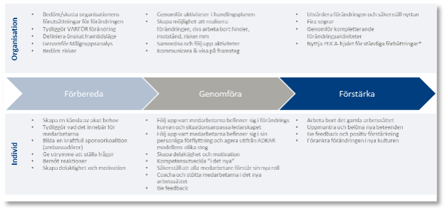 Förändringsledning fokuserar på själva beteendeförändringen som krävs för att lyckas i det nya tillståndet.